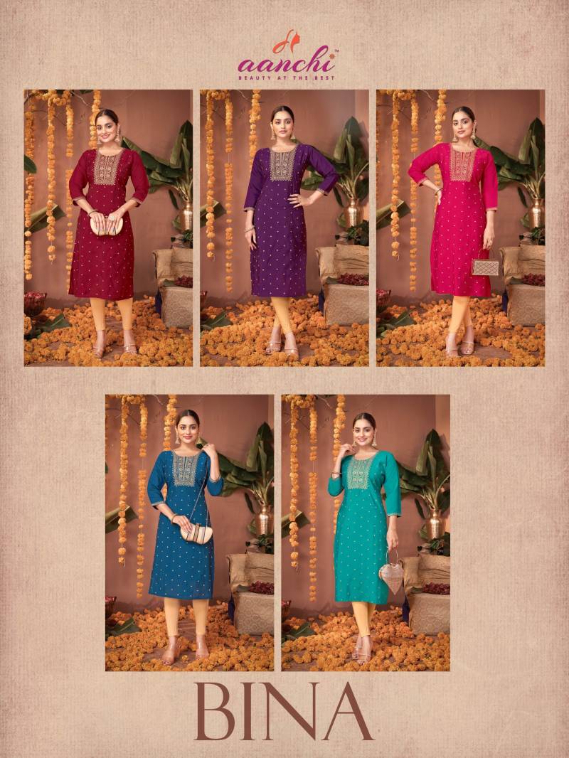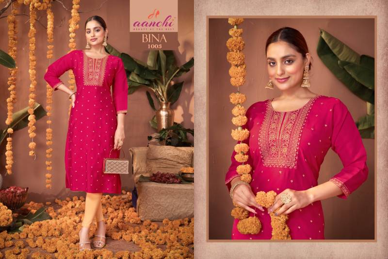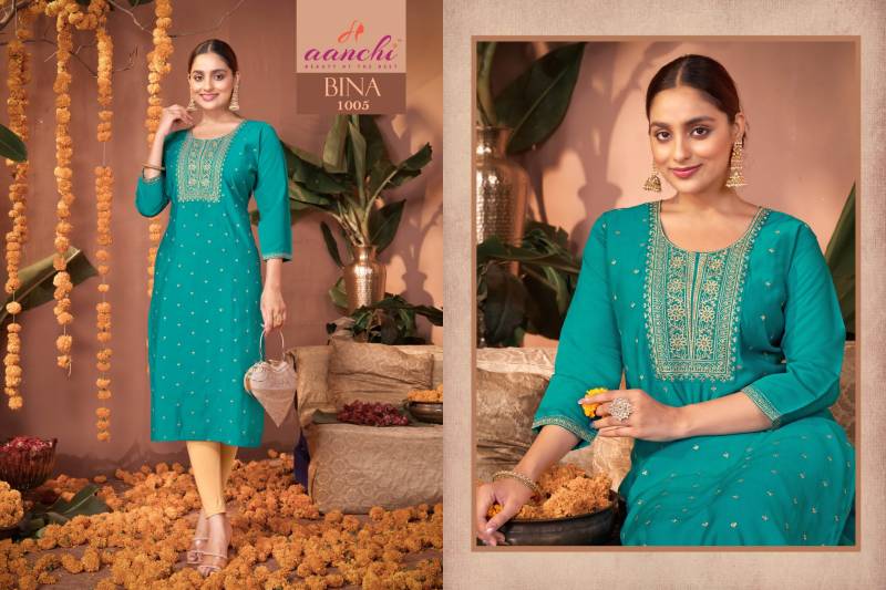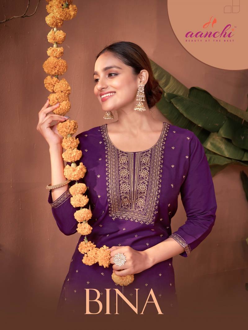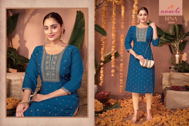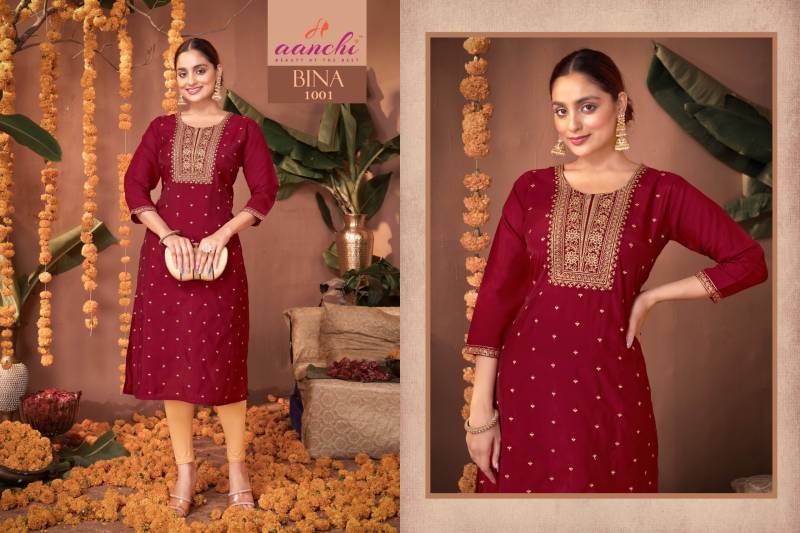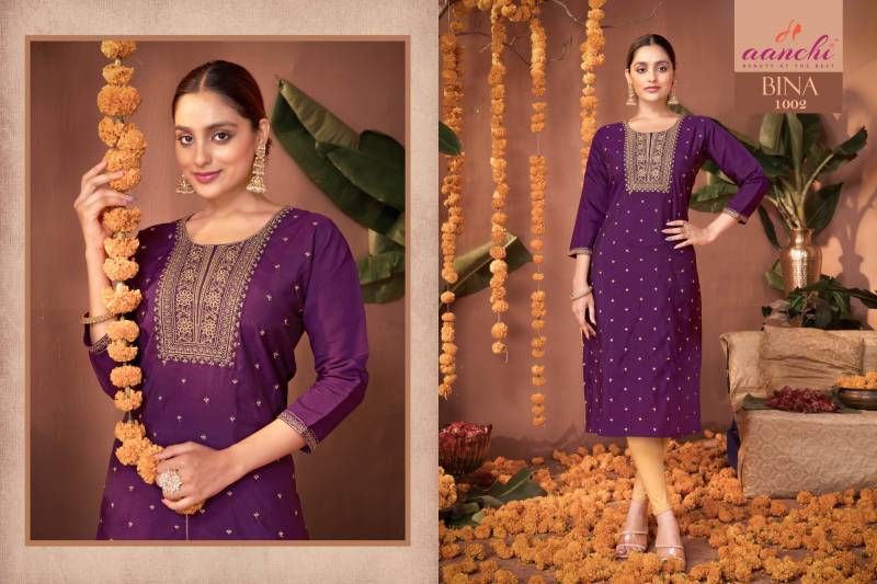 Aanchi Bina Roman Silk Straight Embroidered Kurti Catalog Wholesale Collection Supplier